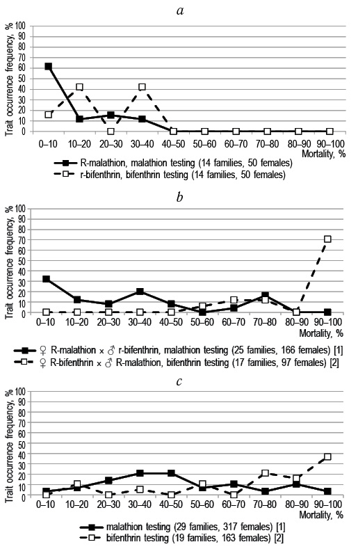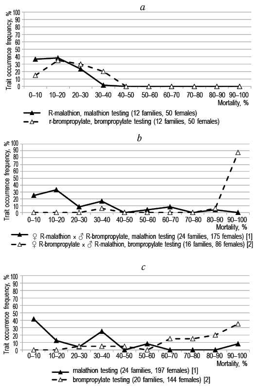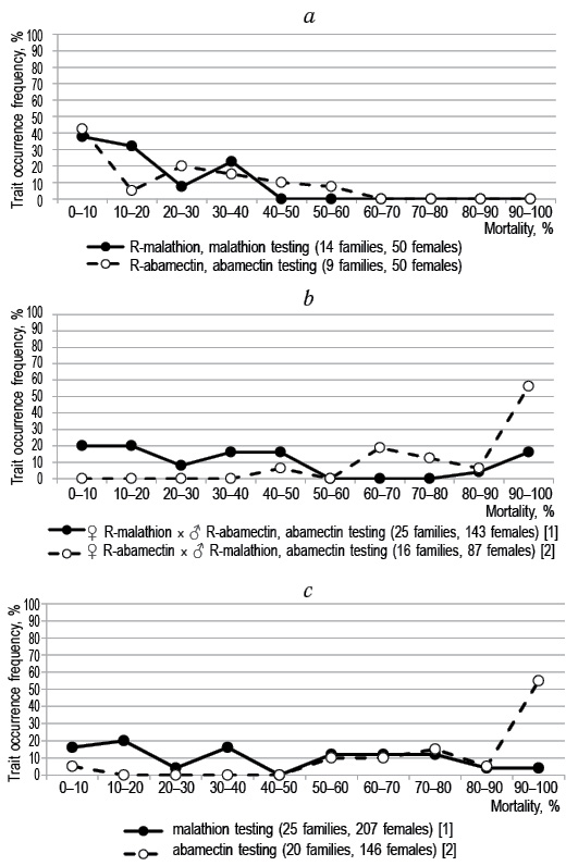 The distribution of the mortality of families of diheterozygous parental females and the families of their first filial generation from diagnostic concentrations of all used acaricides was also equal (Fig. 1, b, c; 2, b, c; 3, b, c).