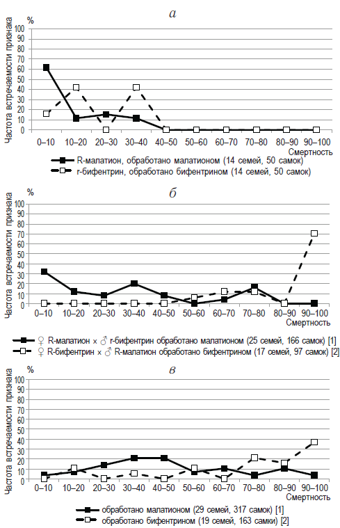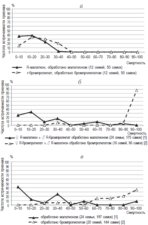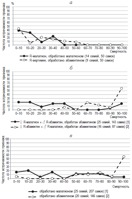На графике, фиксирующем частоту встречаемости признака резистентности, семьи гетерозиготных самок после обработки диагностической концентрацией малатиона распределены равномерно по всем уровням процента смертности. Несколько большее количество семей в зоне до 50 % раздела оказалось только у семей, имевших в геноме аллели резистентности к бромпропилату (рис. 1, б; 2, б; 3, б).