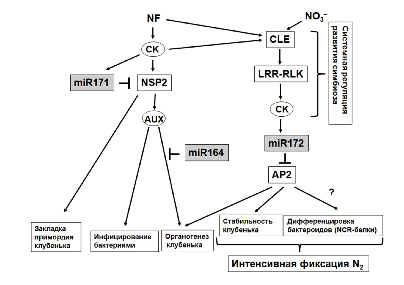 Анализ механизмов системной регуляции сим биоза показал, что в качестве перспективных подходов для усиления N2-фиксации можно рассматривать снижение восприимчивости CLE-белков к активирующему действию нитрата либо повышение устойчивости AP2-регуляторов к ингибирующему действию регуляторной РНК miR172 (см. рис. 1). Важным представляется поиск генов-стимуляторов развития N2-фиксирующей зоны клубеньков, а также индукторов синтеза NCR-белков, определяющих трансформацию ризобий в бактероиды.