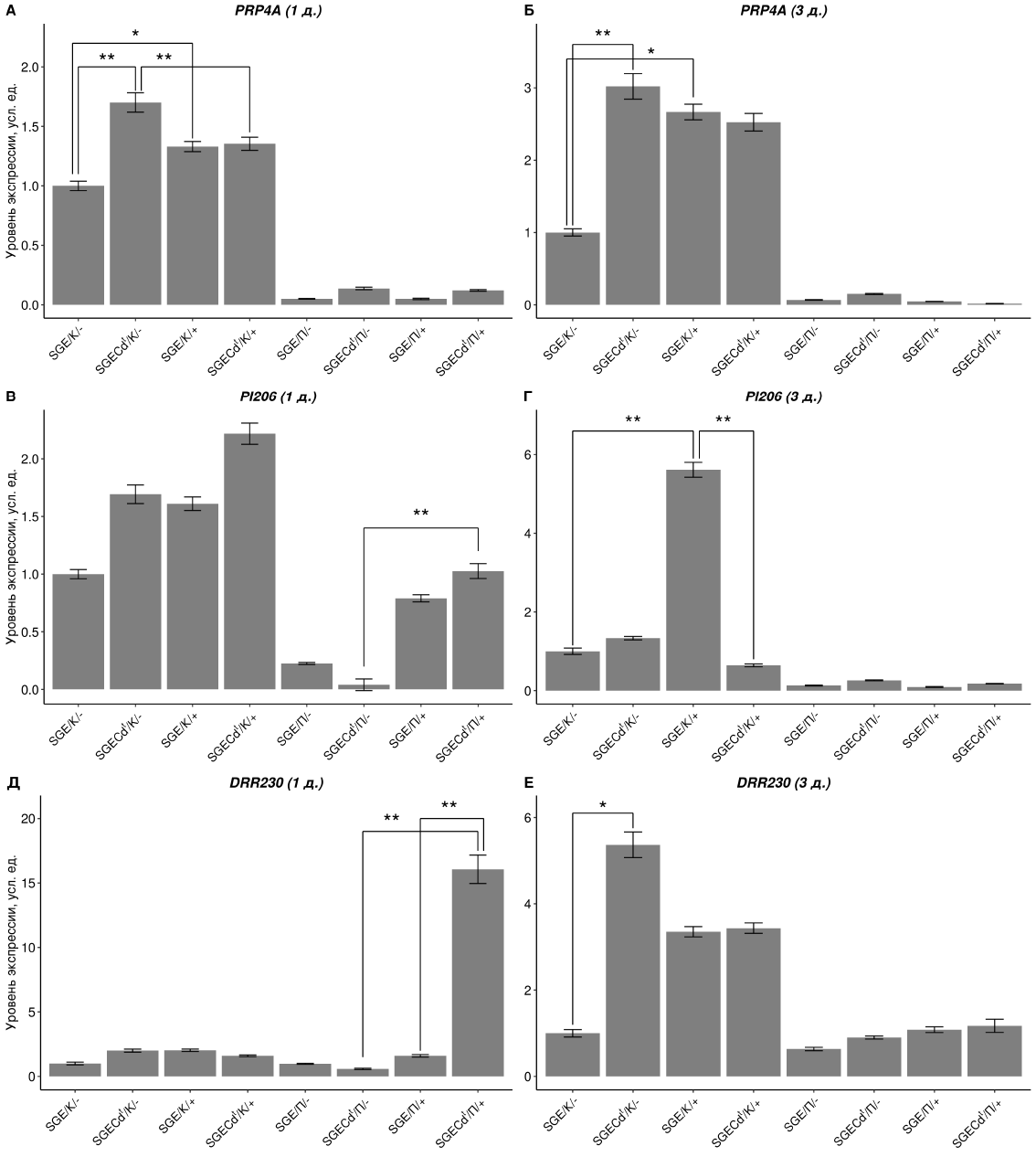 Рис. 1. Изменение уровня экспрессии генов PRP4A (А, Б), PI206 (В, Г), DRR230 (Д, Е) в корнях и побегах исходной линии SGE и мутанта SGECdt в контрольных условиях и при воздействии 3 мкМ CdCl2. «1 д.» — срок 1 сутки, «3 д.» — срок 3 суток. * достоверные отличия, p < 0,05. ** достоверные отличия, p < 0,01. К — корень, П — побег. Знак «-» — контроль, знак «+» — опыт