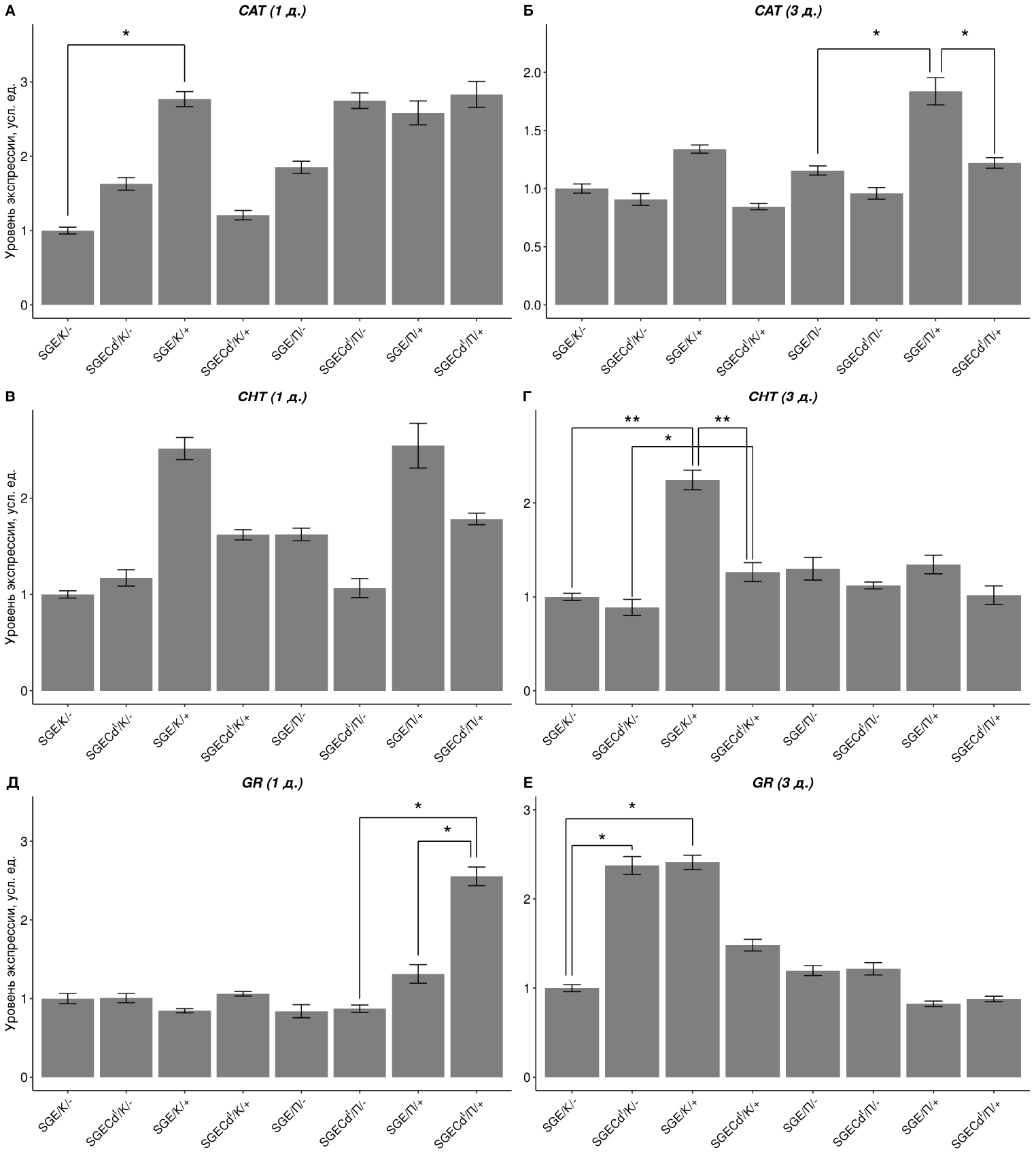 Fig. 2. Changes in the expression of the CAT (А, Б), CHT (В, Г), GR (Д, Е) genes in the roots and shoots of the SGE line and SGECdt mutant under control conditions and after exposition with 3 μM CdCl2. “1 d.” – 1 day, “3 d.” – 3 days. * significant differences, p < 0.05. ** significant differences, p < 0.01. К – the root, П – shoot. “-” – control, “+” – treatment
