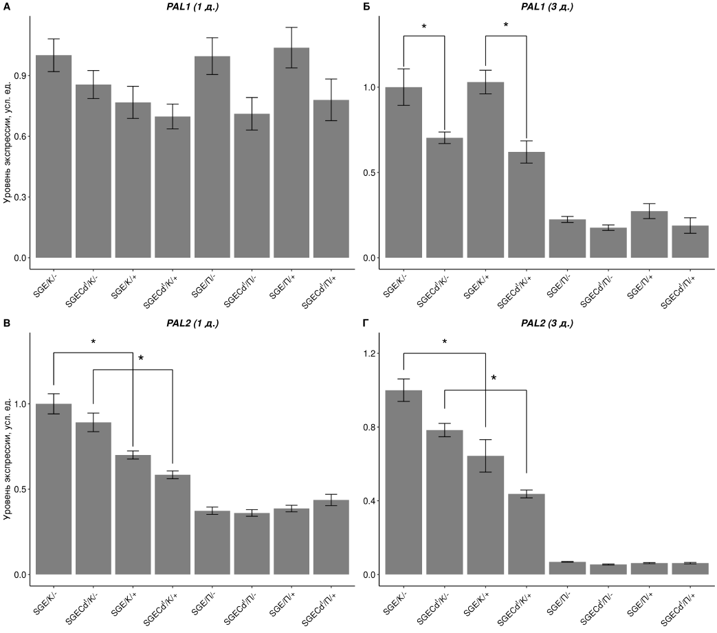 Fig. 3. Changes in the expression of the PAL1 (А, Б), PAL2 (В, Г) genes in the roots and shoots of the SGE line and SGECdt mutant under control conditions and after exposition with 3 μM CdCl2. “1 d.” – 1 day, “3 d.” – 3 days. * significant differences, p < 0.05. ** significant differences, p <0.01. К – the root, П – shoot. “-” – control, “+” – treatment