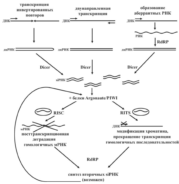 Fig. 1. General scheme of RNA interference pathways. dsRNA – double-stranded RNA; RdRP – RNA-dependent RNA polymerase; complexes of small RNAs and proteins: RISC – RNA-Induced Silencing Complex, RITS – RNA-Induced Transcriptional Silencing
