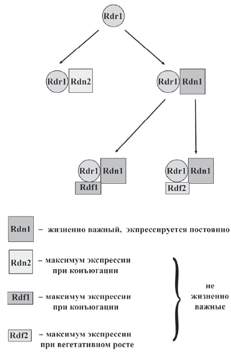 Four major proteins that can be contained within these complexes were identified [27]. Two protein paralogs, Rdn1 and Rdn2 (Rdr1associated nucleotidyl transferases), have homology with poly(A)-polymerase [27] and catalyze the addition of uridine to RNA substrates in vitro outside of the template [27]. Interestingly, the patterns of their gene expression differ: RDN1 is expressed throughout the entire life cycle in both the vegetative phase and during conjugation, whereas the level of expression of RDN2 peaks during conjugation, when the level of RDN1 expression is rather low. Two other proteins associated with Rdr1 lacking domains with certain functions were identified and called Rdf1 and Rdf2 (Rdr1associated factors). The genes encoding them are arranged in the genome in tandem, which indicates that they originated as a result of duplication. Their expression patterns also differ: the level of expression of RDF2 peaks during vegetative growth and is reduced during conjugation, whereas RDF1 is expressed at its maximum level during conjugation and is rather weakly expressed in vegetative cells.