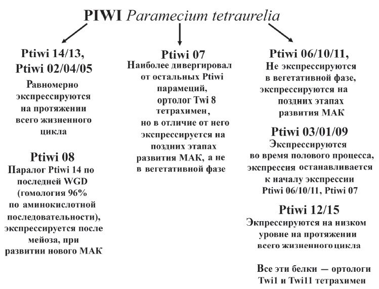 The first subfamily includes the proteins Ptiwi13/14 and Ptiwi02/04/05, the genes of which are uniformly expressed throughout the entire life cycle, as well as protein Ptiwi08. Proteins Ptiwi14 and Ptiwi08 are paralogs, but gene PTIWI8 is activated only after meiosis, in the period of development of a new MAC [7] (see Fig. 4). The second subfamily is formed by a single protein, Ptiwi07, which has diverged the most from the rest of the Piwi proteins of paramecia. This protein is an ortholog of Twi8 tetrahymena; however, their functions are probably different. As the TWI8 gene is expressed at a high level in the vegetative phase and the gene PTIWI07 is expressed at later stages of MAC development [7]. In different periods of the sexual process, the majority of genes of the third subfamily are expressed (see Fig. 4). The PTIWI03/01/09 genes are activated during miosis, the genes PTIWI06/10/11 are expressed simultaneously with PTIWI07 at the final stage of MAC genome formation, and only the genes PTIWI12 and PTIWI15 are constitutively expressed at a low level throughout the entire life cycle. Two IESs are included in the PTIWI10 gene sequence, one of which is placed next to the start codon, and the second one is inside the coding sequence. This feature of the PTIWI10 gene specifies its expression at the later stages of the sexual process; its expression becomes possible only after removal of the appropriate IES [33]. As IESs are included in the coding sequences and regulatory areas of the PTIWI11, PTIWI06, and PTIWI07 genes, it is possible that regulation of their expression is performed in a similar way [33].