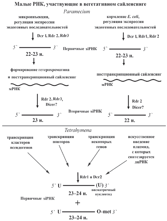 RDRPs and Dicer proteins involved in vegetative silencing in Tetrahymena and Paramecium [по 8, 14, 17, 20, 24, 26, 27]
