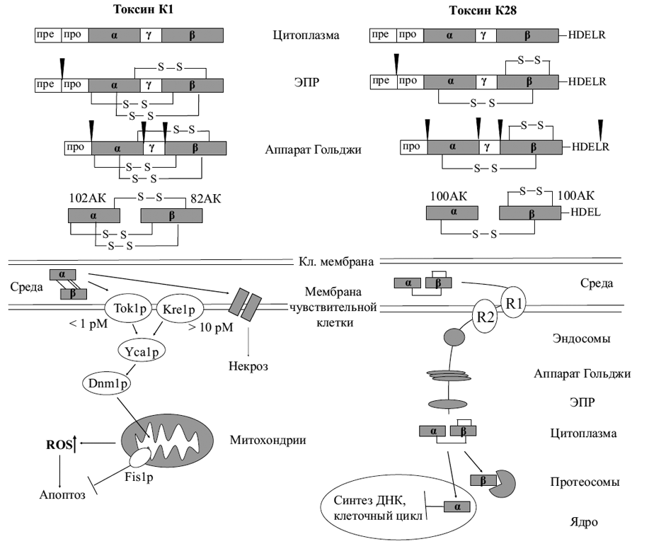 Сейчас известны пути секреции и модификации киллер-токсинов многих видов дрожжей. Лучше всего изучен киллер-токсин К1 (19 кДа), который секретируется в виде двух негликозилированных субъединиц — α (9,5 кДа) и β (9,0 кДа), происходящих от общего гликозилированного предшественника с молекулярной массой 42 кДа (протоксин). Субъединицы α и β связаны дисульфидной связью. Токсины K2 и K28 имеют сходную организацию, в основном на уровне предшественника [22] (рис. 1).