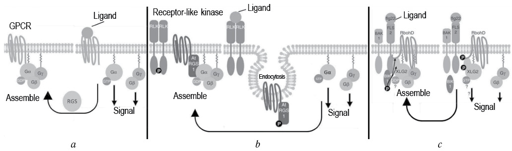 The coordination of G-protein activity in plants can be performed both via RGS protein and directly by receptors to different ligands as well as the intracellular regulators associated with them (Fig. 1, c). In such cases, RGS proteins are not required and signal directly received from membrane receptors. This was demonstrated for an atypical large α-subunit AtXLG2 in Arabidopsis thaliana; the subunit is involved in the interaction with the complex of receptors AtFLS2 and AtBAK1 to the protein flagellum. When AtFLS2/AtBAK1 complex interacts with an active epitope of flagellin (peptide flg22), the protein kinase AtBIK1 is intracellularly activated, which phosphorylates the large α-subunit AtXLG2 of heterotrimeric G-protein and the NADPH oxidase AtRBOH associated with it (see Fig. 1, c). This contributes to the dissociation of heterotrimeric G-protein and transfer of signal-regulating nonspecific immune response of Arabidopsis (see Fig. 1, c) [12].