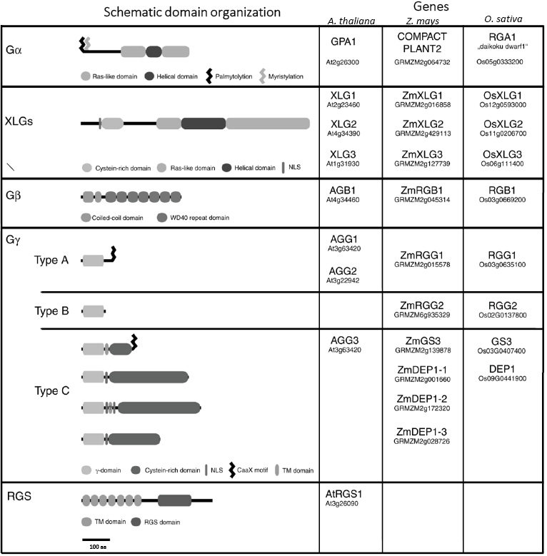 Fig. 2. Scheme of the organization of subunits of heterotrimeric G-proteins and plant RGS. Given the designation of the corresponding genes and accession numbers in the databases for some model plants. A scale bar corresponding to 100 amino acid residues is shown. TM — transmembrane domain; CaaX — prenylation domain (according to [24], as amended)