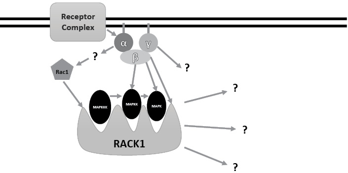 Fig. 3. Integration of heterotrimeric G-proteins, MAP-kinases with the RACK1 scaffold protein and Rac1 small GTPase in signaling pathways
