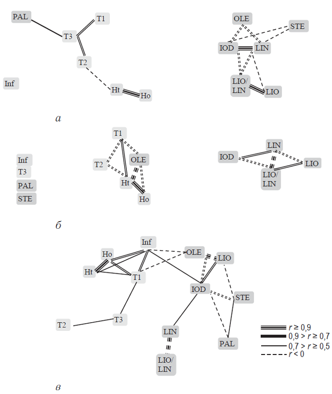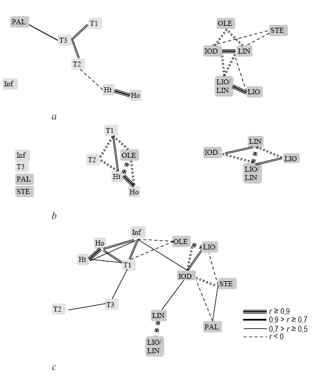The analysis of correlation systems between traits was conducted for each flax group (as per Pearson) plotting correlation pleiade. Factors of correlation between the z-converted matrix of correlation were calculated for the assessment of the similarity of link systems for each of three groups. These traits demonstrate a similarity of matrix structure [22].