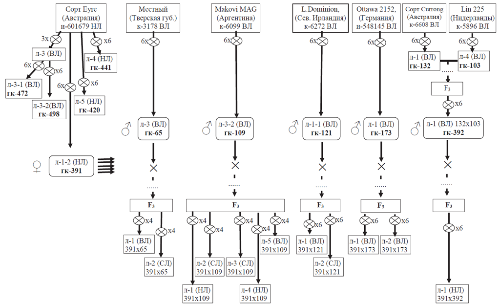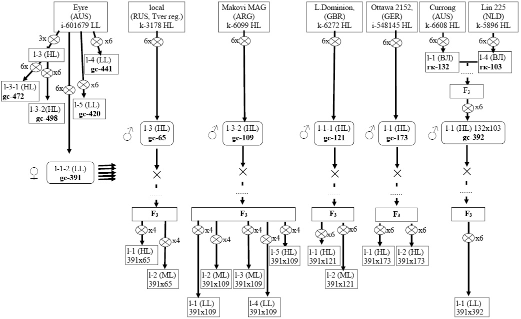 The LL CVs available for us are late ripening and are not adapted to the conditions of Russia; therefore, the study objective was to select prospective early ripening forms. It was shown that hybrids, in which breeding record the line gc-109 presented, were ripen 8 to 10 days earlier than the parental LL line gc-391. The most prospective ML line l-3 and LL lines l-1 and l-4 were from the crossing of gc-391 × gc-109.