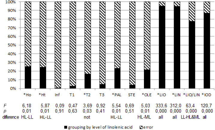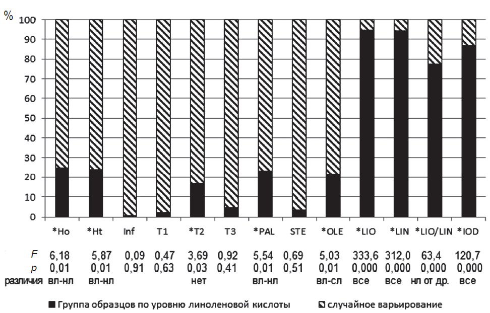 The difference between the flax grouped by LIN level was evaluated by the criterion of Tukey’s honestly significant difference for unequal selections with post hoc pairwise comparison of means after declining hypothesis Н0 about the absence of differences with the results of ANOVA [19, 20].