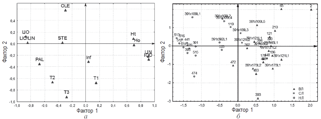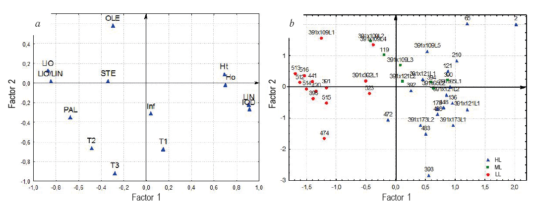 Results. ANOVA showed significant differences HL, ML and LL groups for PAL, OLE, LIO, LIN, LIO/LIN, IOD. Considerable decrease of LIN, causes asymmetric changes in FA ratio and correlations between them and other traits. Factor analysis revealed the influence of two factors. The first one divided lines according to their LIN level and characters associated with it, the second one – according to the VP and OLE. LIN synthesis is controlled by two complementary genes LuFAD3A and LuFAD3B. Sequencing of LuFAD3A gene 1 exon of 6 lines revealed a mutation (G255 → A255), resulting in formation of stop codon. Developed developed CAPS-marker confirmed the homozygosity of hybrids between LL (gc-391) and HL lines (gc-65, 109, 121). Descendants of hybrid between gc-109 and gc-391 ripened 8-10 days earlier than gc-391. CAPS markers of LuFAD3B gene revealed differences between HL, ML, LL lines. Sequencing of this gene first exon and the beginning of the second one in 3 lines (1HL, 2LL) showed that this method reveals a mutation in the second restriction site, located in the 2 exon (C6 → T6), and causing the replacement Hys → Tyr.
