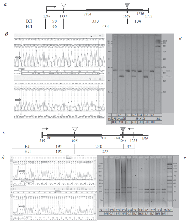 For the second gene, LuFAD3B, the previously published protocol was used for the detection of mutation in the first exon [13]. The product of amplification has a length of 468 bp. When it is sequenced, the mutant alleles of lines gc-391 and gc-515 detected replacement in position 6 (С → T) of the second exon, which resulted in the replacement of Hys → Tyr. It was shown that the use of restrictase BsaJI allows to identify the mutant allele. Two sites are available for restrictase within the amplified fragment of allele of the wild type (Fig. 5). Fragments with a length of 191, 240, and 37 bp are formed during its decomposition. The mutations specified above are in position 431 of the product of amplification and involve one of the three restriction sites, which results in the formation of fragments with a length of 191 and 277 (240 + 37) bp. A restriction product of 37 bp of HL forms is combined with the low molecular nonspecific products of amplification; the one gets false impression about the difference of HL and LL forms in size of the larger product of amplification. Thus, the CAPS marker proposed previously for genotypes 593 to 708 can be used for gc-391. It was detected that lines from LL CVs Linola (gc-394), Eyre (gc-391, 420), and Walaga (gc-395) and accession 858 (gc-515) are homozygous by mutation in this area of gene (Table 4). Based on the available data of the NCBI sequences of allele of LuFAD3B gene (KF026416), it was detected that cv Amon has the same point mutation as gc-391.