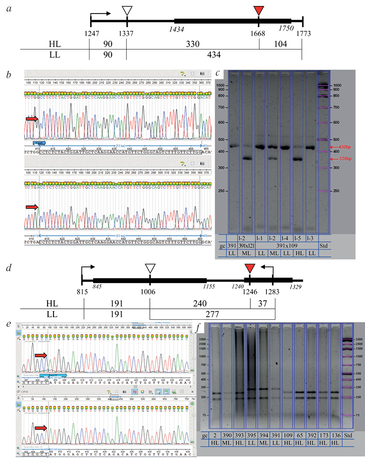 LL cv Eyre (Australia) was one of the first to come to VIR ollection that was heterogeneous by LL genes. Several lines were obtained on its basis, but only one line is used for crossing (gc-391). By means of obtained markers, homozygosis of hybrids from cross-breeding of LL (gc-391) and HL lines (see Table 3; Fig. 5) by gene LuFAD3A was confirmed. Progeny F7 l-1, 1-3, 1-4 from hybrid gc-391 × gc-109, l-2 from hybrid gc-391 × gc-65 and progeny F9 l-1 from hybrid gc-391 × gc-392 are homozygous by recessive allele of LuFAD3A gene. Progeny F9 l-1, l-2 from hybrid gc-391 × gc-121, gc-391 × gc-121 and progeny F7 l-1 gc-391 × gc-65, l-5 from hybrid gc-391 × gc-109 are homozygous by the dominant allele of this gene. Progeny F7 l-2 from hybrid gc-391 × gc-109 appeared to be heterozygous by this gene. Line l-2 from gc-391 × gc-121 is interesting: it is homozygous by the recessive allele of LL gene with the results of DNA analysis, but it has the boundary content of LIN; therefore, it was attributed to HL instead of ML. Thus, parental line gc-121 has a different way to slightly increase the level of LIN. Although the references describe only two genes responsible for LIN synthesis, according to our information, the genetic surrounding is rather important.