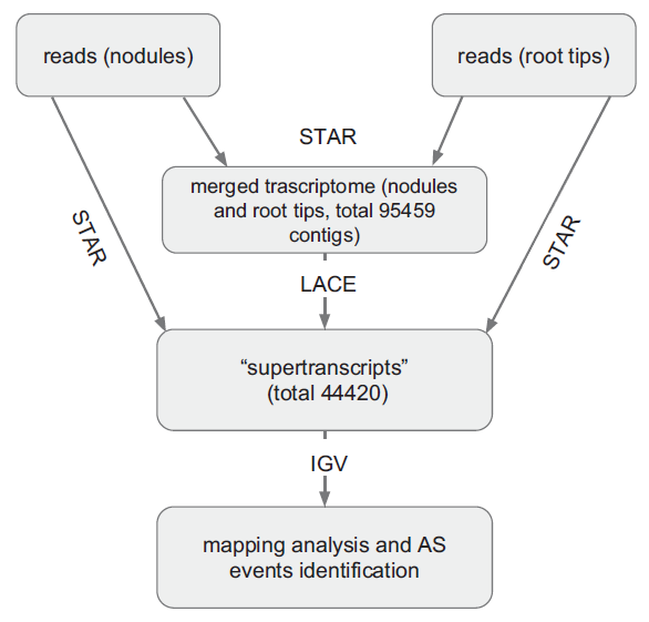The results of RNA-seq experiments were used as a material for computer-aided data analysis, such as assembly and raw reads of the nodules of the SGE line, assembly and raw reads of the root tips of the SGE line [14], assembly of the transcriptome of different pea tissues of the Cameor line [16], and assembly of the transcriptome of various pea tissues of the JI2822, Terese, and JI992 lines (GEUU01.1) [17], as well as Kaspa and Parafield [18]. To achieve this, we used an algorithm recommended by the authors of the Lace tool (available at https://github.com/Oshlack), with minor modifications (Fig. 1). The quality of raw reads was controlled by FastQC [19]. Tails were trimmed, and low-quality reads were removed using the Trimmomatic [20]. Decontamination was performed using the BBtools software package [21]. The reads that passed quality control were aligned to the transcriptome assembly using the STAR program [22], since this algorithm enables detection of the splice sites.