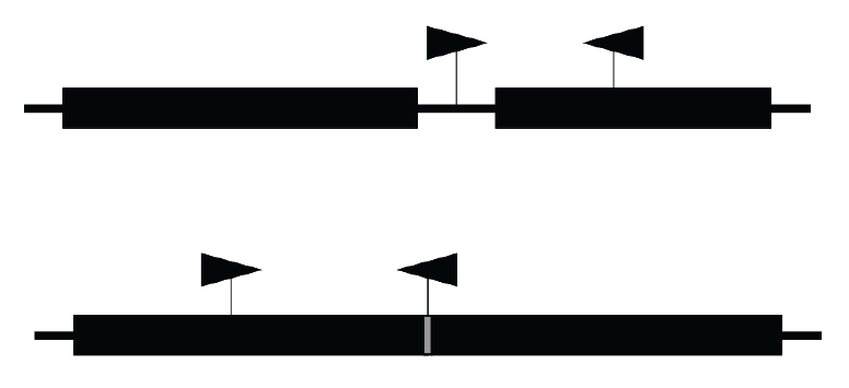 Fig. 2. Layout of primers for quantitative assessment of isoforms. The upper figure is an isoform diagram with an intron (broad blocks are exons, narrow is an intron). The bottom figure is an intron-free isoform diagram (black blocks are exons, gray is the border of exons)