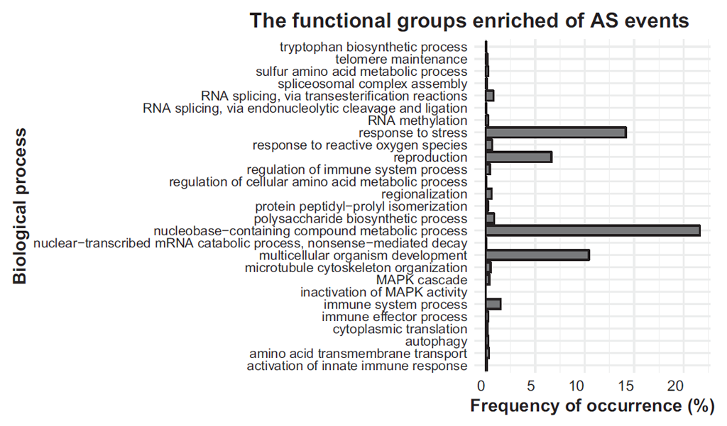 Fig. 4. Enrichment of various functional groups with alternative splicing events. Frequency is the percentage of total transcripts showing alternative splicing falling into this functional group
