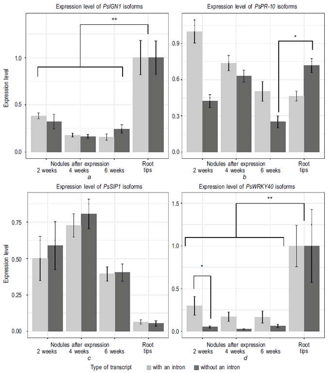Fig. 5. Comparison of expression of the pea gene isoforms PsPR-10, PsWRKY40, PsIGN, PsSIP1. In fig. a the lines are connected to the comparison group, demonstrating statistically significant differences (roots relative to nodules in terms of 2, 4, 6 weeks), in fig. d significant differences are shown for isoforms in roots relative to nodules at 2, 4, 6 weeks and separately isoforms with intron and without in nodules for 2 weeks (* p < 0,05, ** p < 0,0001)