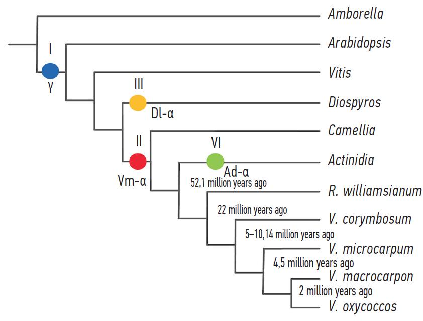 Additionally, this analysis revealed two polyploidization events in the evolution of the genus Vaccinium, namely an ancient γ-tripplication and a later whole-genome duplication (Vm-α) shared with other members of the Ericaeae, Theaceae D. Don, and Actinidiaceae Gilg & Werderm families approximately 58 million years ago. This age determination is consistent with the Dl-α duplication of the genome in Diospyros L. (order Ericales, family Ebenaceae Gürke) and the Ad-α duplication in Actinidia (Fig. 3).