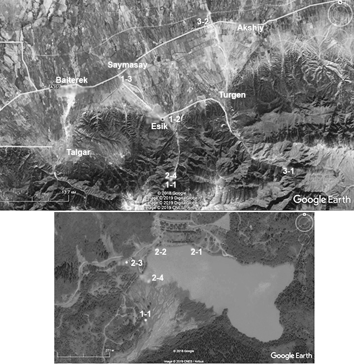 Fig. 1. The location of water sampling points in the suburban area of Almaty: No. 1 — river Esik (p. No. 1-1, 1-2, 1-3); No. 2 — Lake Esik (p. No. 2-1, 2-2, 2-3, 2-4); No. 3 — river Turgen (p. No. 3-1, 3-2)