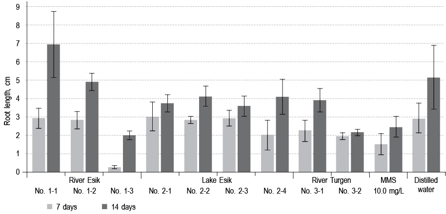 Fig. 2. The average length of the roots of Allium cepa exposed to water samples from water bodies near the city of Almaty for 7 and 14 days