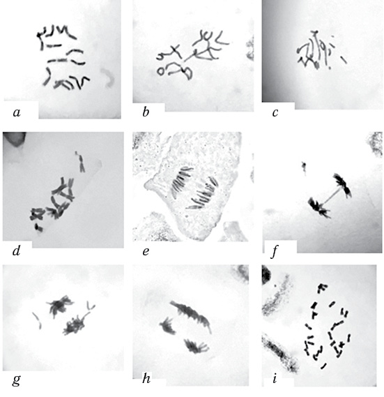 Fig. 3. Chromosome abnormalities induced by the waters of natural sources in barley seeds: a is the norm in metaphase (2n = 14); b — centric ring; c — acentric ring; d — chromatid terminal deletion; e — the norm in anaphase; f — bridge; g — lagging chromosomes; h — multipolar mitosis; i — polyploid set (2n = 28)