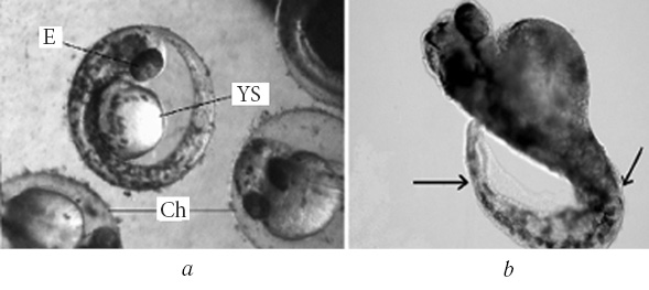 Fig. 4. Development of the D. rerio embryo in normality and pathology: а — is a normal D. rerio embryo in the chorion, ×40; E — eyes, YS — yolk sac, Ch — chorion; b — embryo with abnormal development of the caudal region and growth retardation, ×100; the arrows indicate the curvature of the axial skeleton