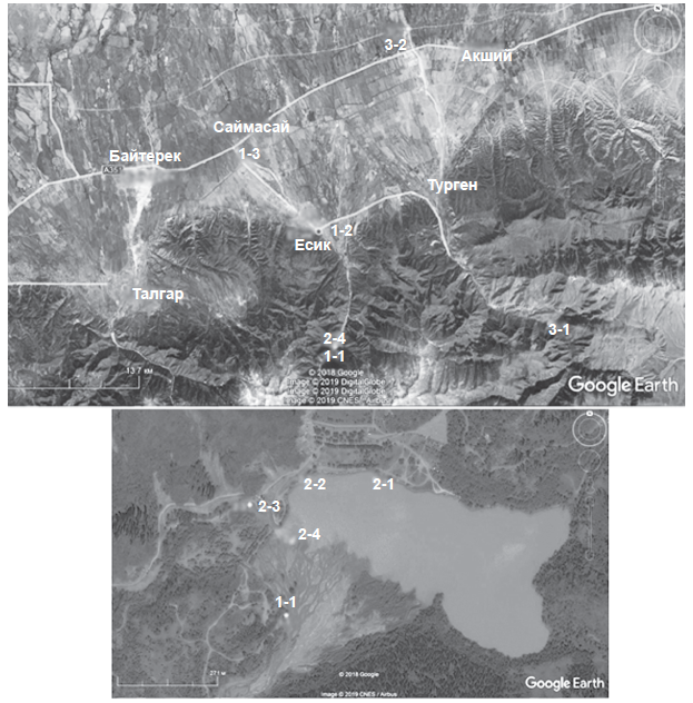 Рис. 1. Месторасположение точек пробоотбора образцов воды в пригородной зоне г. Алматы: № 1 — р. Есик (т. № 1-1, 1-2, 1-3); № 2 — оз. Есик (т. № 2-1, 2-2, 2-3, 2-4); № 3 — р. Турген (т. № 3-1, 3-2)