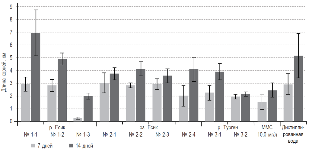 Рис. 2. Средняя длина корней Allium cepa, подверженных воздействию образцов воды из водных объектов вблизи г. Алматы в течение 7 и 14 дней