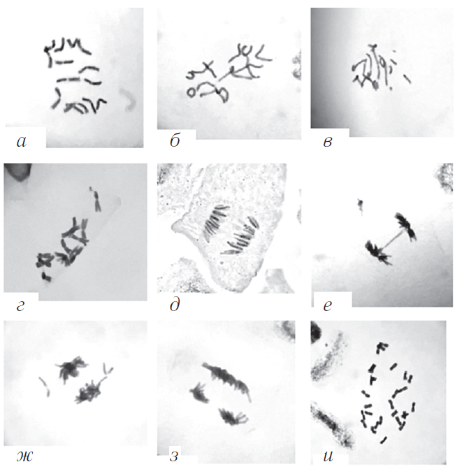 Рис. 3. Нарушения хромосом, индуцированные водами природных источников в семенах ячменя: а — норма в метафазе (2n = 14); б — центрическое кольцо; в — ацентрическое кольцо; г — хроматидная терминальная делеция; д — норма в анафазе; е — мост; ж — отставание хромосом; з — многополюсный митоз; и — полиплоидный набор (2n = 28)