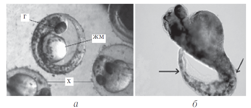 Рис. 4. Развитие эмбриона D. rerio в норме и при патологии: а — нормальный эмбрион D. rerio в хорионе, ×40; Г — глаза, ЖМ — желточный мешок, Х — хорион; б — эмбрион с аномальным развитием хвостового отдела и задержкой роста, ×100; стрелками указаны искривления осевого скелета