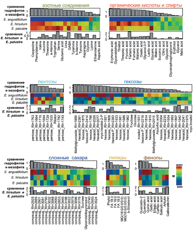 Рис. 1. Тепловая карта среднего нормализованного содержания идентифицированных метаболитов. Столбчатые диаграммы — VIP из моделей OPLS-DA для сравнения: вверху — гидрофитов и мезофита, внизу — E. hirsutum и E. palustre. В названиях метаболитов: compsug — сложные сахара или молекулы с сахарными частями, RI — индекс удерживания, -P — фосфат, FA — жирная кислота, MG — моноацилглицерин