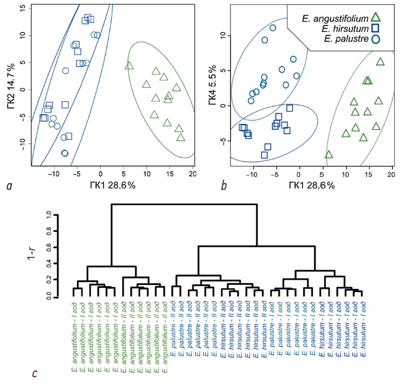 Рис. 2. Анализ без обучения профилей метаболитов трех видов Epilobium, собраных в течение двух лет: a, b — графики счетов методом главных компонет (ГК), эллипсы — 95 % доверительные интервалы; с — дендрограмма иерархической кластеризации (с расстоянием Пирсона (1-r), агломерация методом Уорда)