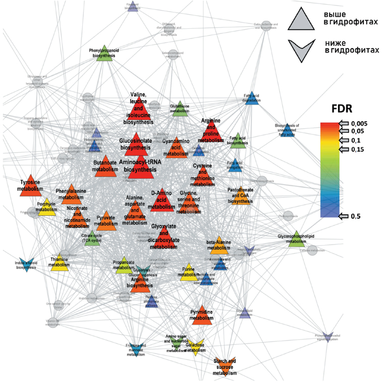 Рис. 3. Анализ обогащения наборов метаболитов на основе факторных загрузок из OPLS-DA-моделей классификации гидрофитов и мезофита. Узлы — пути, полученные из базы KEGG. Если пути имеют общие метаболиты, то они соединены ребром. Края притягиваются в зависимости от количества общих метаболитов. Цвет — значимость влияния на этот путь, размер — сила влияния (|NES|). NES — нормализованная оценка обогащения (normalized enrichment score), FDR — уровень ложноположительных результатов (false discovery rate)