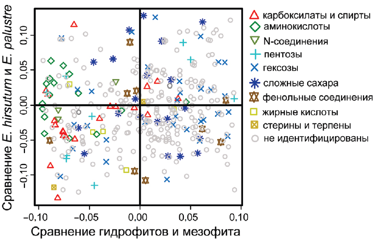 5. Fig. 4. Comparison of differences between hydrophytes and mesophyte and between two hydrophytes. SUS (shared and unique structures) plot in the space of the loadings from two OPLS-DA models. Positive loadings correspond to a higher content in mesophyte and in E. palustre