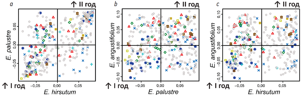 6. Fig. 5. Comparison of annual changes in metabolite profiles of three Epilobium species: a — comparison E. palustre vs E. hirsutum; b — comparison E. angustifolium vs E. palustre; с — comparison E. angustifolium vs E. hirsutum. SUS plots in the loadings space of the corresponding OPLS-DA models. Positive loadings correspond to a higher level in the second year of observations