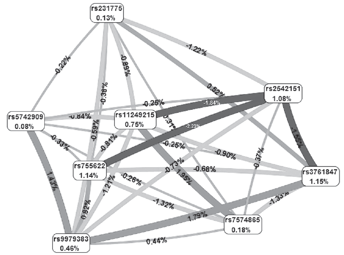 3. Fig. 2. Polymorphic loci and their contribution to disease susceptibility, measured as entropy in % are shown in the rectangles. Entropy values that characterize paired loci interactions are depicted on lines, connecting the respective rectangles