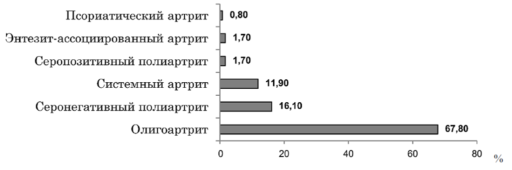 Рис. 1. Распределение группы пациентов с ювенильным идиопатическим артритом по подтипам заболевания