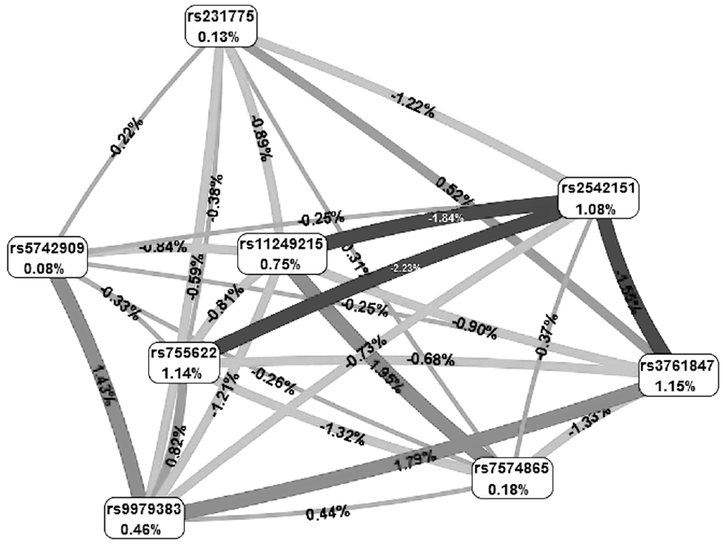 Так как возможности MDR позволяют оценивать не только парные сочетания полиморфных вариантов, с помощью «конструктора атрибутов» (Attribute Construction) была создана новая переменная — «rs5742909, rs231775, rs3761847, rs9979383, rs2542151», вклад которой в предсказательный потенциал модели составил 10,44 %, что в 3,6 раза больше простой арифметической суммы показателей энтропий для этих локусов.