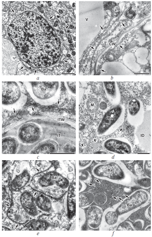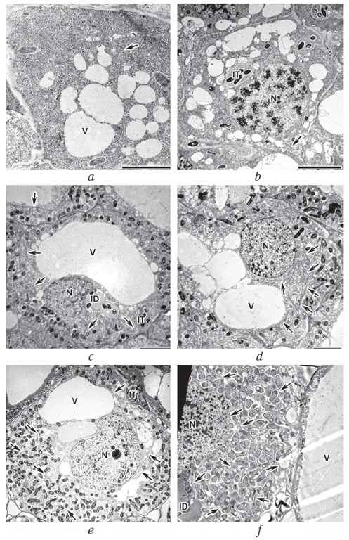 Fig. 1. The endoplasmic reticulum in the wild-type symbiotic nodules of P. sativum: a – cell of the meristem; b – cell of the meristem with infection threads; c – cell from the early infection zone; d – cell from the late infection zone; e – infected cell from the early nitrogen fixation zone; and f – mature infected cell from the nitrogen fixation zone. a, b, e, f – Sprint2; c, d – SGE. N – nucleus, V – vacuole, IT – infection thread, ID – infection droplet; arrows indicate profiles of the RER. Bar: 5 µm