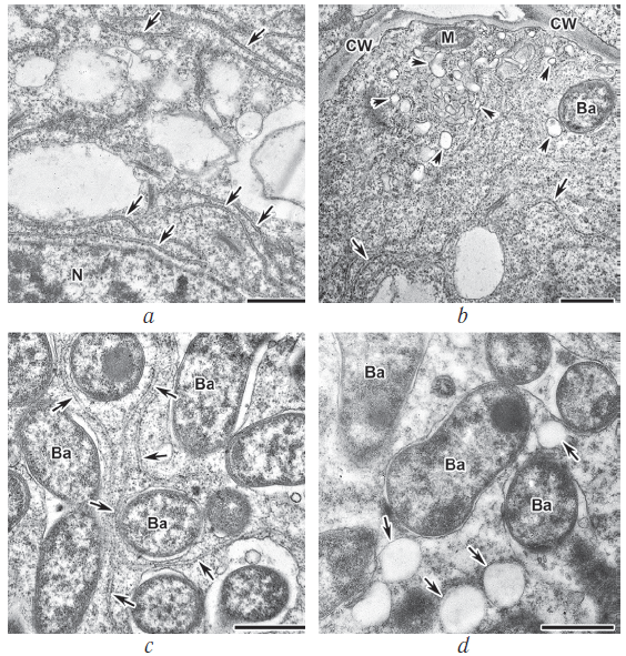 Fig. 3. The endoplasmic reticulum in the nodules of P. sativum mutant line SGEFix–-3 (sym26): a – parallel cisternae around the nucleus; b – SER network; c – around individual symbiosomes or groups of symbiosomes; and d – an extension of RER profiles and partial ribosome loss in some cells. N – nucleus, M – mitochondrion, CW – cell wall, Ba – bacteroid; arrows indicate RER profiles, arrowheads – SER profiles. Bar: 500 nm
