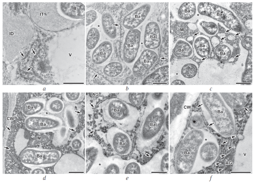 Fig. 4. The endoplasmic reticulum in the nodules of P. sativum mutant lines SGEFix–-1 (sym40) (a–c) and SGEFix–-2 (sym33-3) (d–f): a – around the vacuole and infection threads and droplets; b – around symbiosomes; c – extension and fragmentation of RER profiles with partial loss of ribosomes; d – along the plasma membrane; e – around symbiosomes; and f – SER network. M – mitochondrion, AG – Golgi apparatus, V – vacuole, CW – cell wall, IT – infection thread, ID – infection droplet, B – bacterium, Ba – bacteroid, * – symbiosome containing several bacteroids surrounded by a common symbiosome membrane; arrows indicate RER profiles, arrowheads – SER profiles. Bar: 500 nm