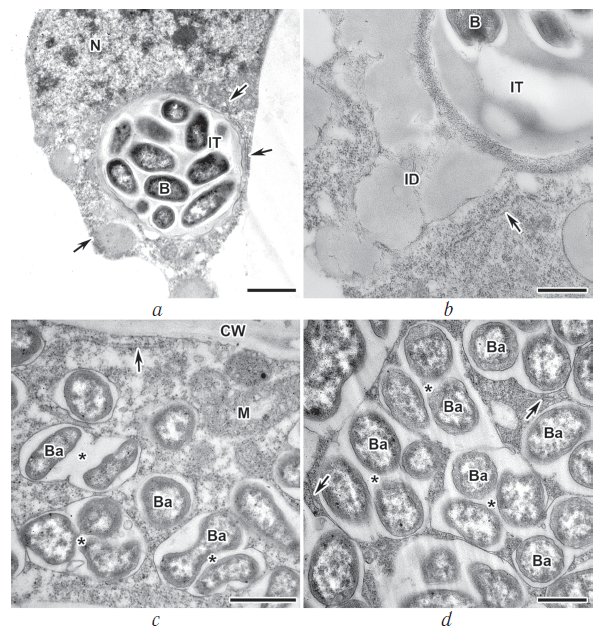 Fig. 5. The endoplasmic reticulum in the nodules of P. sativum mutant lines SGEFix–-2 (sym33-3) (a, b) and Sprint-2Fix– (sym31) (c, d): a – in a narrow layer of the cytoplasm around the nucleus and infection threads; b – along bacterial free infection droplets; and c – along the plasma membrane; d – around symbiosomes. N – nucleus, M – mitochondrion, CW – cell wall, IT – infection thread, ID – infection droplet, B – bacterium, Ba – bacteroid, * – symbiosome containing several bacteroids surrounded by a common symbiosome membrane; arrows indicate RER profiles. Bar: a, c – 1 µm, b, d – 500 nm