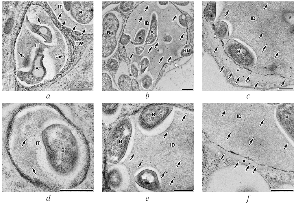 Fig. 1. Immunogold labelling showing the distribution of arabinogalactan protein-extensin epitopes in thin sections from the nodules of pea wild-type SGE: a–c – МАС204; d–f – МАС236. IT – infection thread, ITW – infection thread wall, ID – infection droplet, B – bacterium, RB – releasing bacterium, Ba – bacteroid, * – newly synthesised matrix; arrows indicate gold particles. Bar: 500 nm