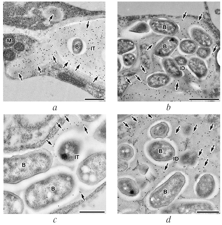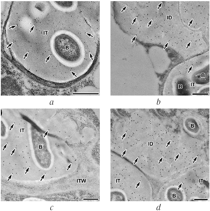 Fig. 4. Distribution of arabinogalactan protein-extensin epitopes in the nodules of pea mutant line SGEFix–-2 (sym33-3): a, b – МАС204; c, d – МАС236. IT – infection thread, ITW – infection thread wall, ID – infection droplet, B – bacterium; arrows indicate gold particles. Bar: 500 nm.