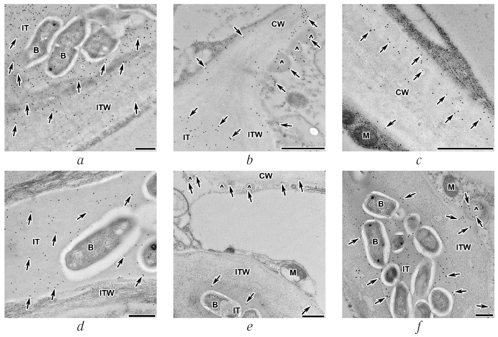 Fig. 5. Distribution of arabinogalactan protein-extensin epitopes in the nodules of pea double mutant line RBT3 (sym33-3, sym40): a–c – МАС204; d–f – МАС236. IT – infection thread, B – bacterium, ITW – infection thread wall, CW – cell wall, M – mitochondrion, ^ – transport vesicles with intercellular matrix; arrows indicate gold particles. Bar: 500 nm