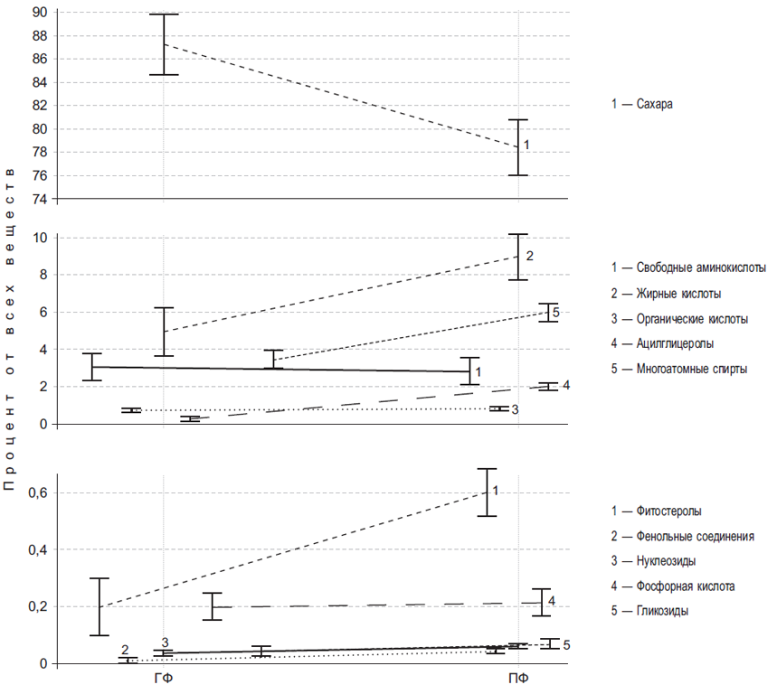 PC1 (F1, 23.8% of the variance) included the most content of fatty and organic acids, phosphoric acid, polyatomic alcohols (myoinositol, glycerol phosphate, and galactinol), MAG-1 С16:0, as well as some amino acids and phytosterols with a minimum content (less than 0.05%; Fig. 2, a).