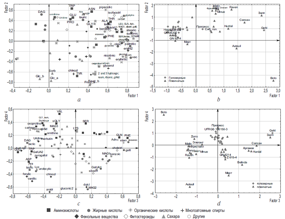 PC1 separated NFs from most CFs in terms of the contents of fatty and organic acids, polyatomic alcohols, and free amino acids (Fig. 2, b). The NF and CF groups turned out to be heterogeneous. Within the NF group, a subgroup was formed, which had a high content of organic and fatty acids, polyatomic alcohols, and MAG-1 С16:0. It included the naked varieties such as Sibirsky Golozerny, Progress, and Gehl. Some CFs (e.g., Haga, Effective, and GN08207) were similar to naked ones because of PC1.